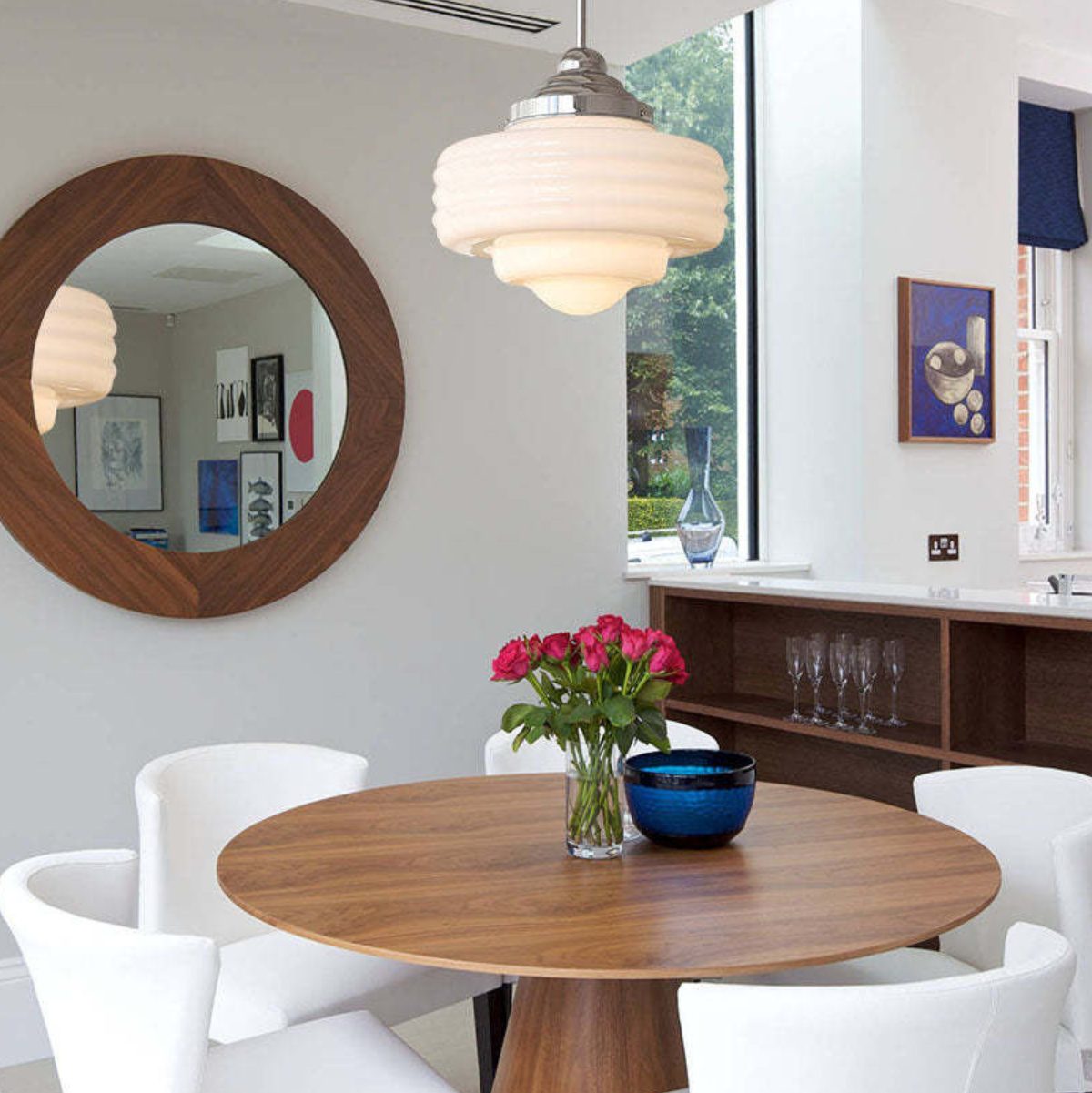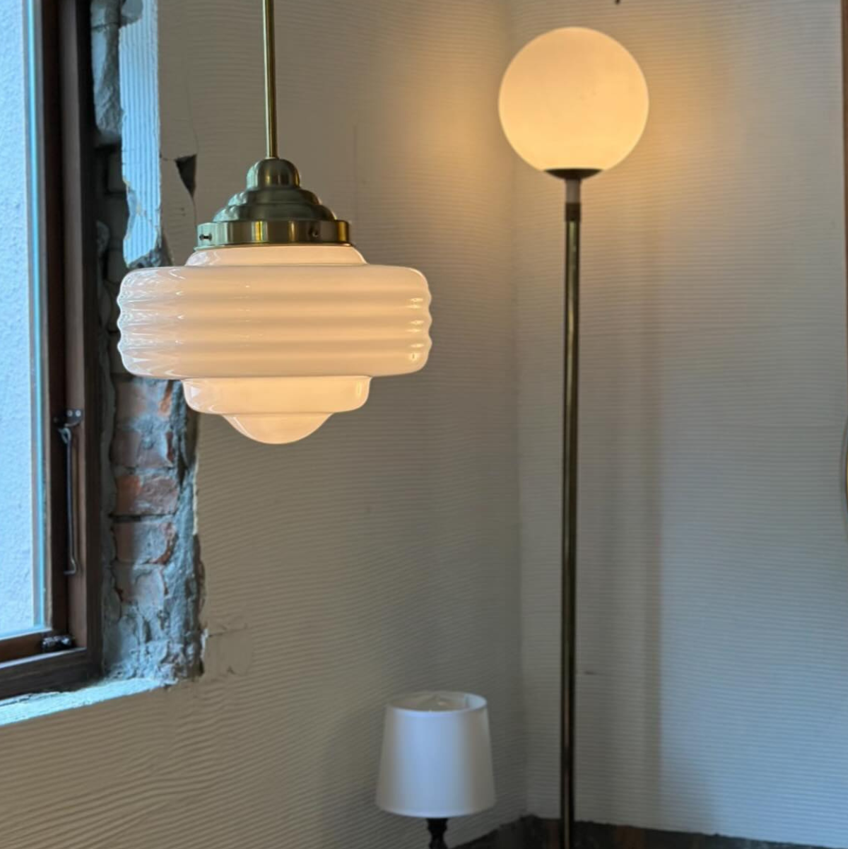 The opaline art glass shade disperses the pendant’s 3000K warmth into a broad, even wash that lowers contrast and flatters skin tones and tabletop surfaces alike. Combined with the iron frame’s clean lines, the lamp creates layered depth—gentle illumination up close, sculptural presence from across the room.