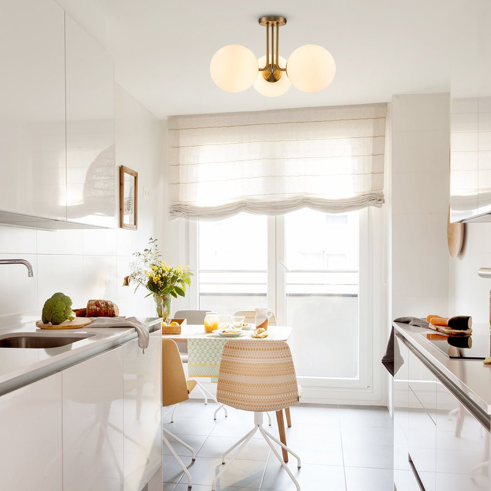 This semi flush mount ceiling light brings balanced, mid-century styling to kitchens, hallways, and dining areas. The semi flush mount ceiling light features frosted glass shades and a metal frame to deliver soft, diffused illumination while maintaining a low-profile silhouette.