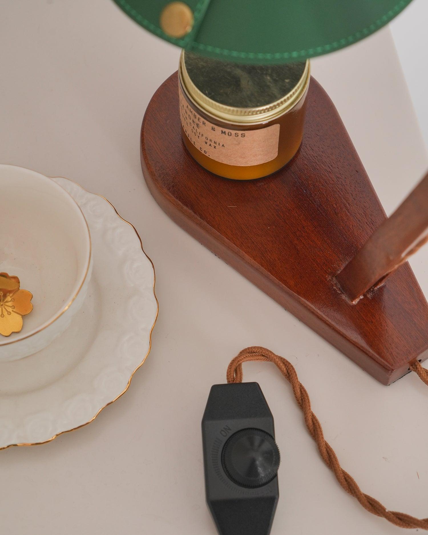 - Material: Solid wood body and base, metal hardware, fabric shade